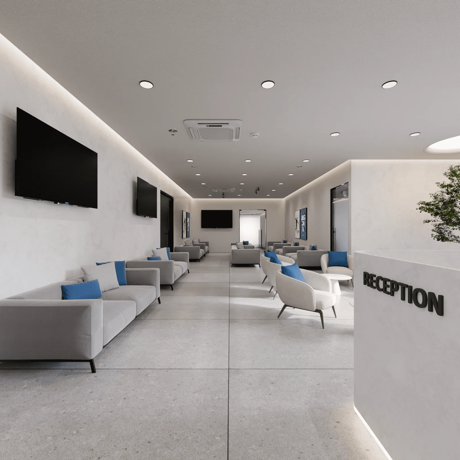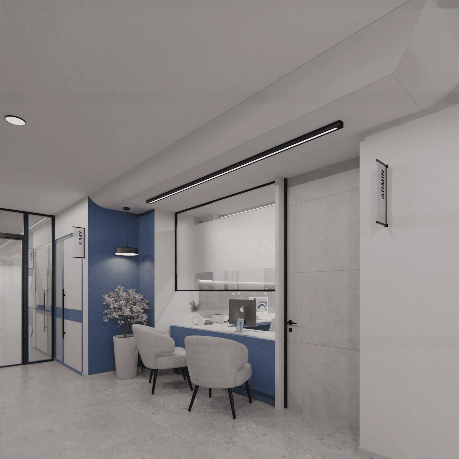The interior reception area redefines the traditional waiting room, prioritizing patient comfort and a tranquil atmosphere.