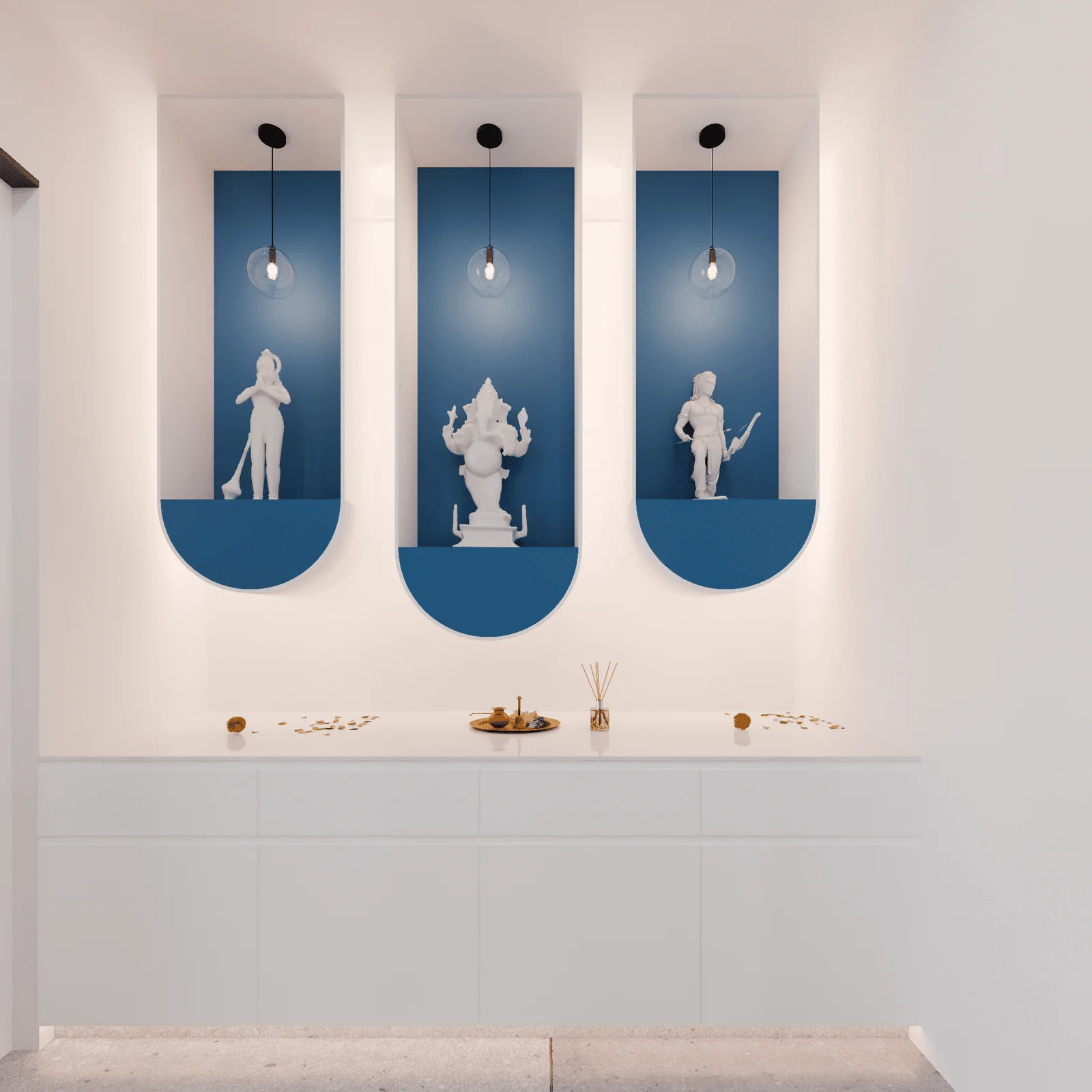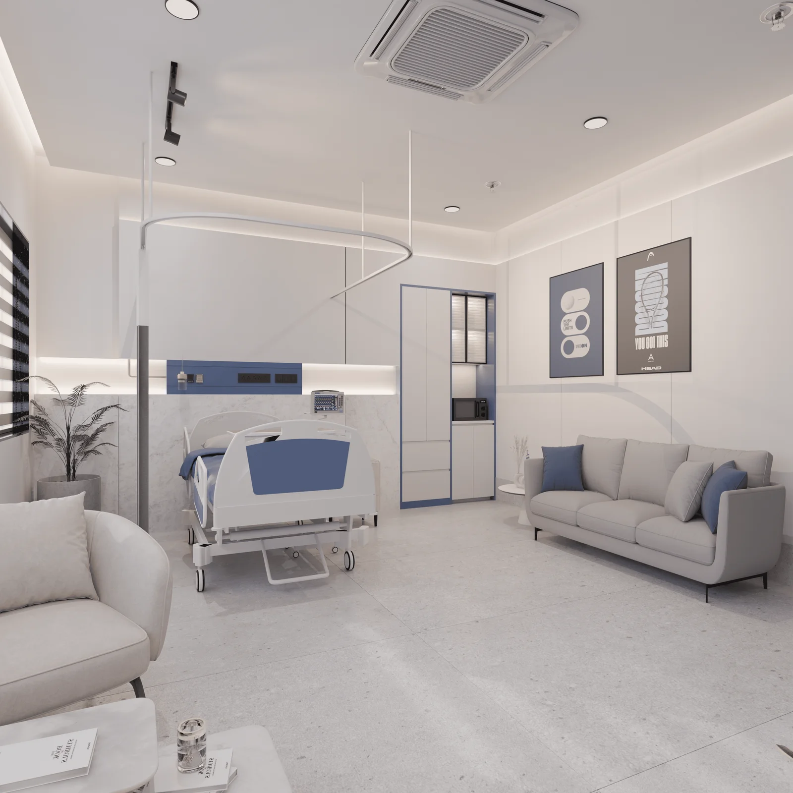 We utilised a light, contemporary colour scheme dominated by white marble, light grey flooring, and accents of soft blue and white furnishings. This palette is scientifically proven to be calming and fosters a sense of hygiene and modernity.