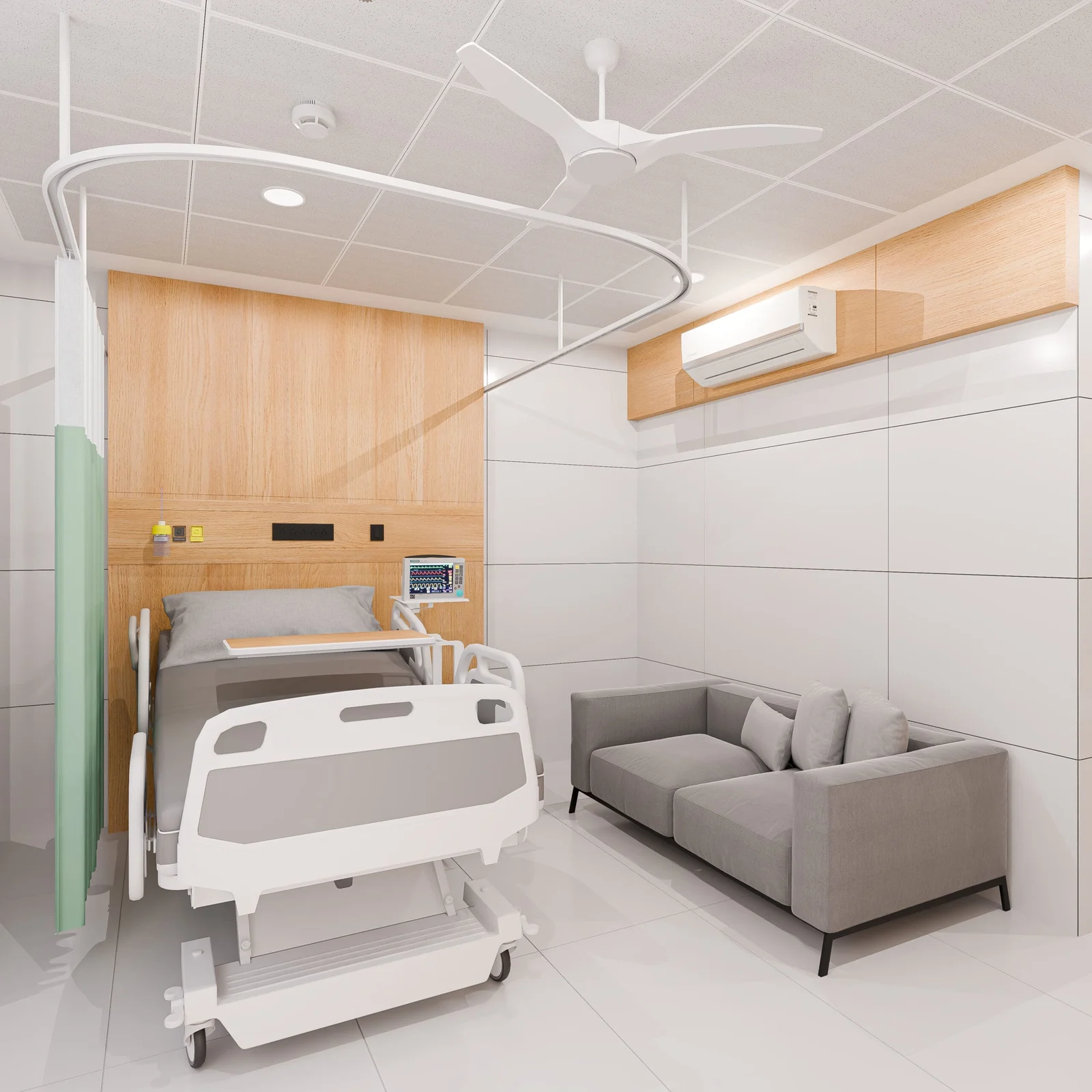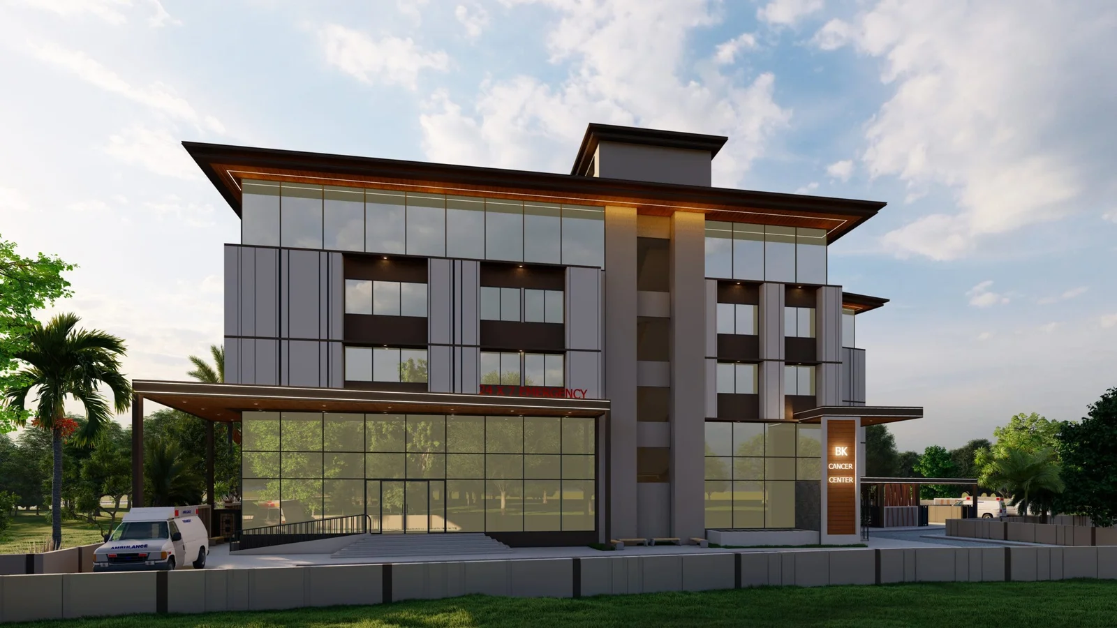 The exterior of BK Cancer Center, a 72-bed facility spanning 51,000 sq ft, presents a contemporary face of healing. The architectural language blends strength with serenity, utilizing clean lines and a balanced composition of solid and transparent elements. Expansive glass facades invite natural light deep into the building, fostering a connection with the outside world and promoting a sense of openness. The contrasting textures of the building materials, likely a combination of sturdy panels and sleek glass, speak to both the advanced medical care within and a commitment to a comfortable healing environment. The thoughtful integration of covered entryways offers shelter and ease of access, while subtle signage clearly identifies the center, ensuring wayfinding is intuitive and stress-free for visitors. The presence of an ambulance at the entrance underscores the center’s readiness and dedication to immediate patient care