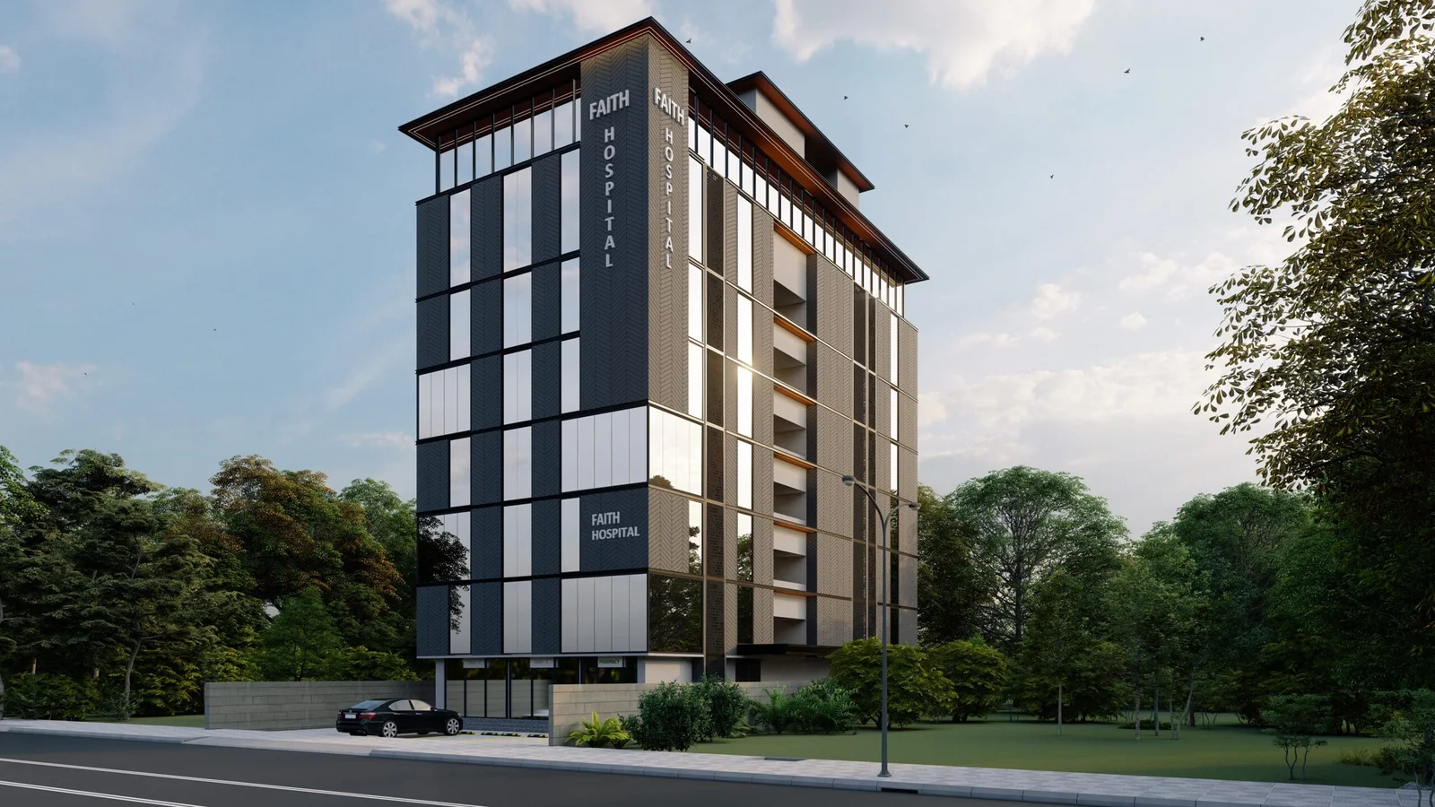 The facade of Faith Hospital is a striking example of modern urban healthcare architecture. The building’s elevation is defined by a bold and dynamic interplay of dark gray and sleek white panels, creating a visual rhythm that is both sophisticated and contemporary. The vertical arrangement of the hospital’s name, “FAITH HOSPITAL,” serves as a powerful and elegant branding element, visible from a distance. Expansive glass windows flood the interiors with natural light, a key element in patient recovery and staff well-being. The design thoughtfully integrates the hospital’s form with its surroundings, with a clean and professional aesthetic that projects a sense of stability and advanced care.