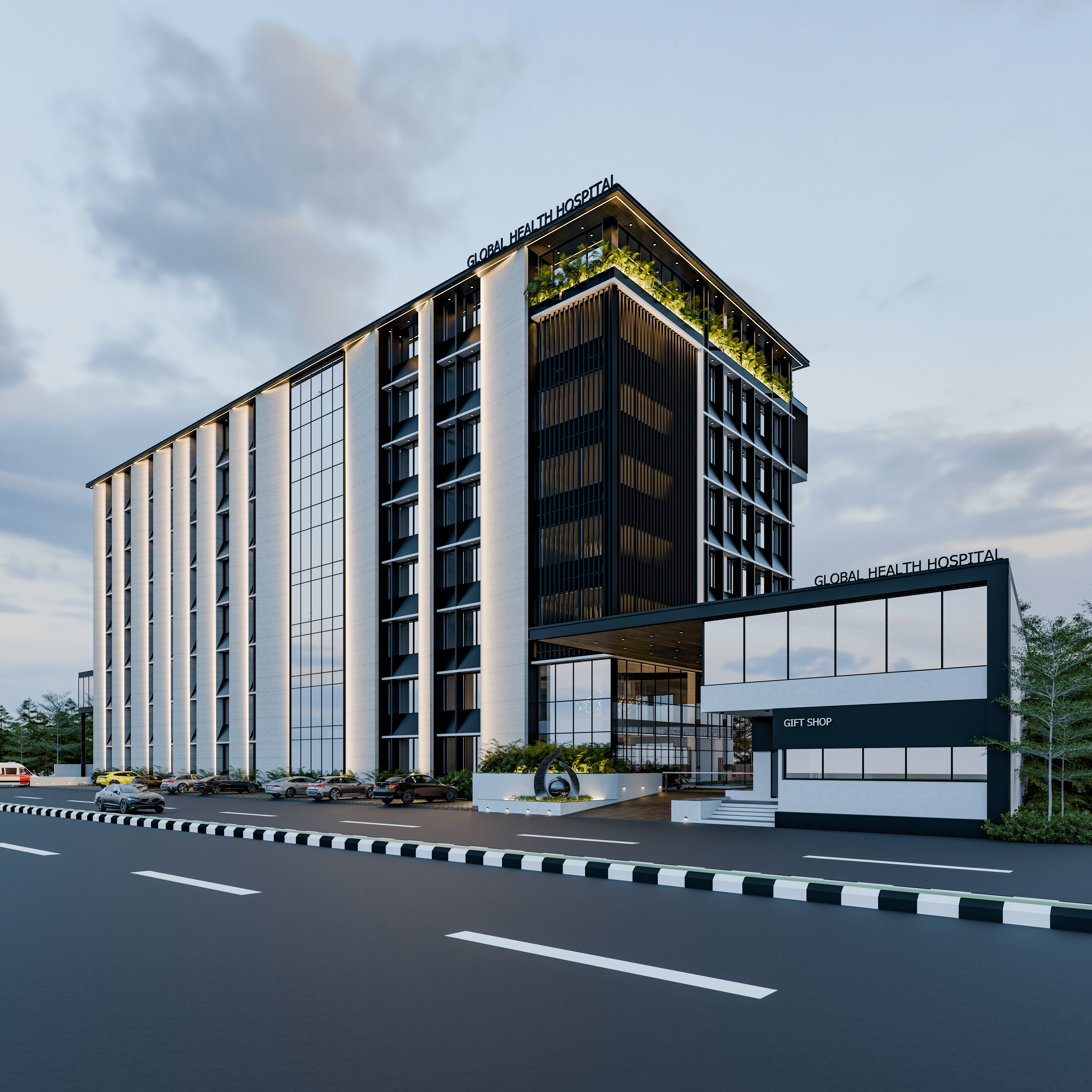 The facade of Global Hospital is a powerful and modern architectural statement. The building’s design features a dynamic interplay of vertical white columns and horizontal black slats, creating a sophisticated rhythm that draws the eye. The large glass windows and curtain walls ensure the interior is flooded with natural light, a key component in healing and well-being. A prominent feature is the striking black cantilevered canopy and a glass-enclosed walkway, which not only provide shelter but also lend a sense of grandeur and accessibility. This design successfully marries a sleek, professional aesthetic with an inviting and open feel.