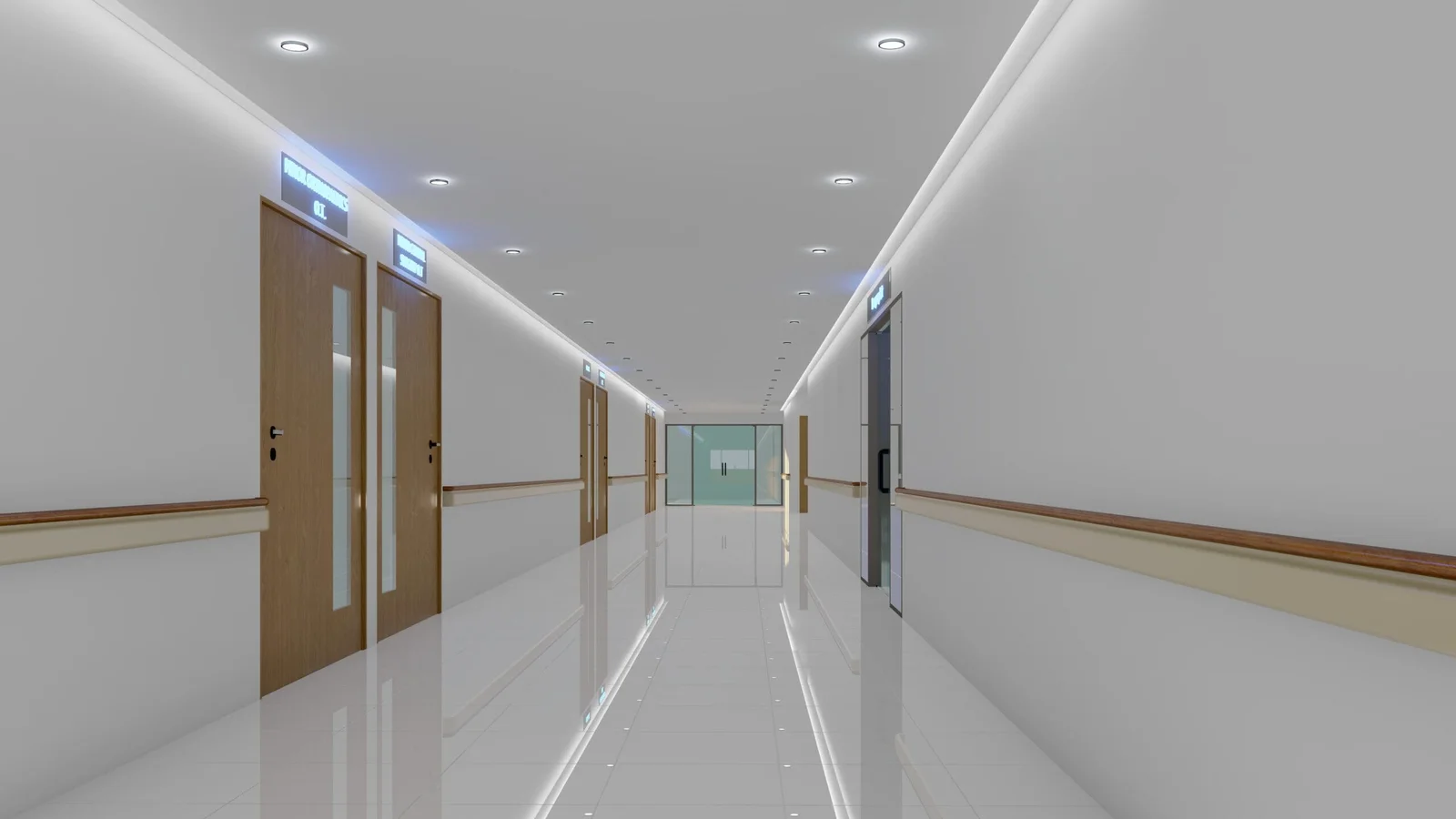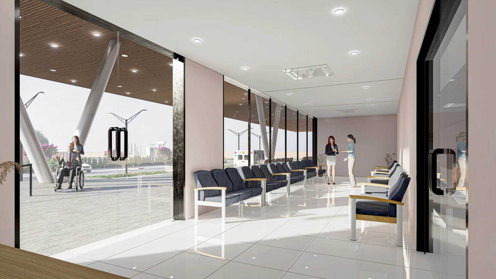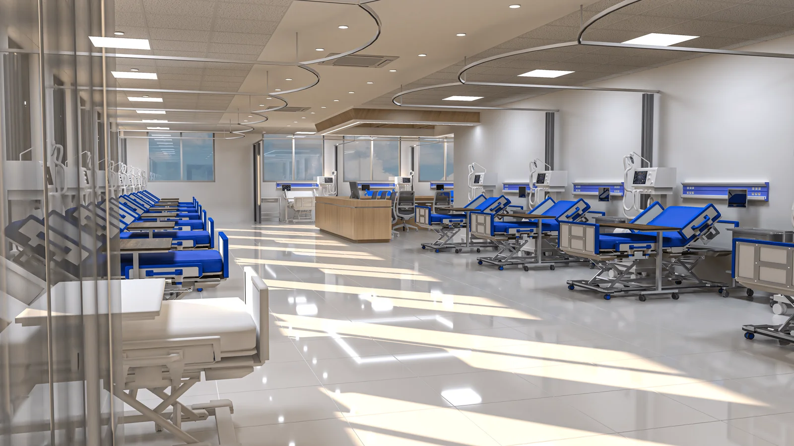 The emergency ward is bright and open, with a clean aesthetic that reduces stress. The efficient layout and natural light from large windows create a calm, organized environment, prioritizing patient well-being and staff accessibility.