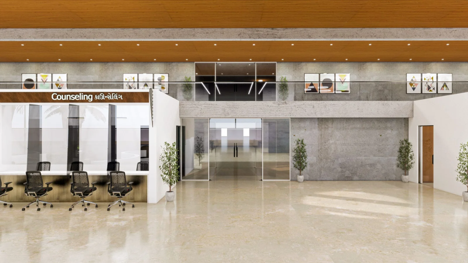 This counter area is a model of functional design, using warm wood tones and minimalist signage for clarity. The layout is planned for high efficiency, with a long counter and ergonomic seating that supports a smooth, professional patient experience.