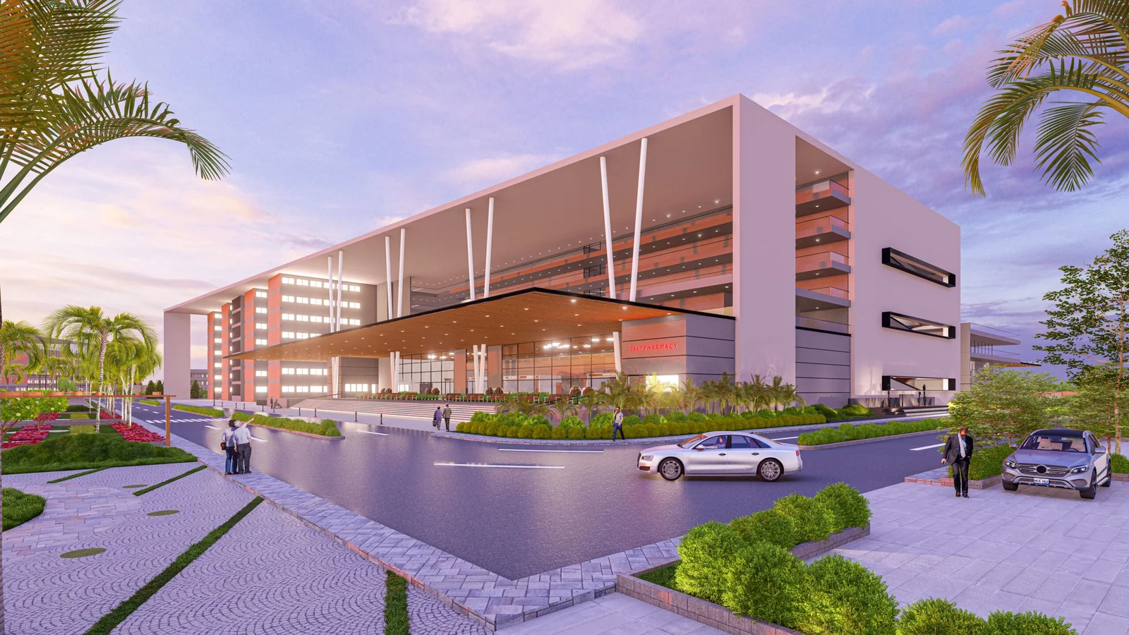 The reception is a welcoming atrium with flowing lines and a serene palette. Integrated planters and layered lighting create a calming atmosphere, while intuitive signage guides patients seamlessly, transforming the space from a waiting room into a therapeutic environment. This grand healthcare campus accommodates 1,200 beds and spans approximately 25,00,000 sq ft, reflecting its scale and capacity to serve a large patient community.