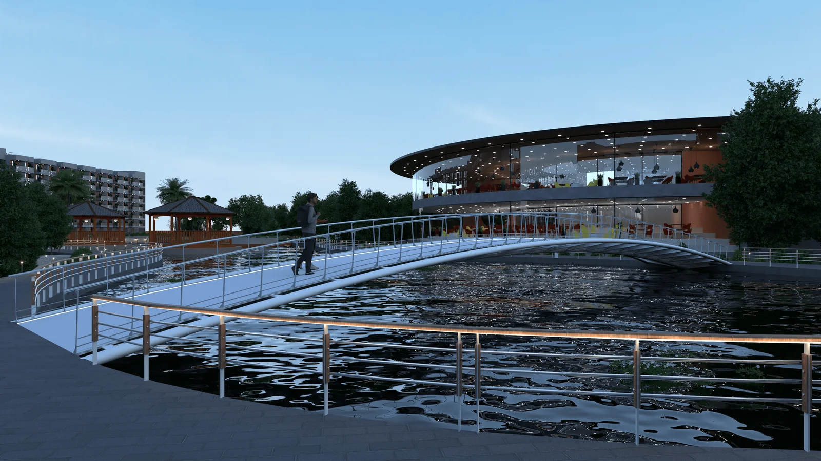A striking circular building with glass walls offers panoramic views, creating a vibrant dining hub. A connecting bridge and a bright interior with red chairs make it a modern, inviting space for social gatherings and meals.