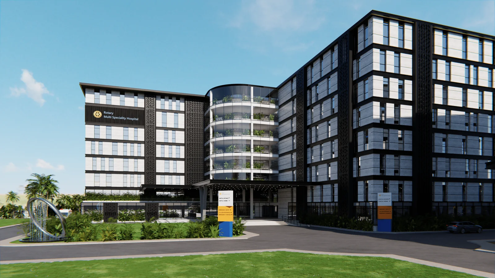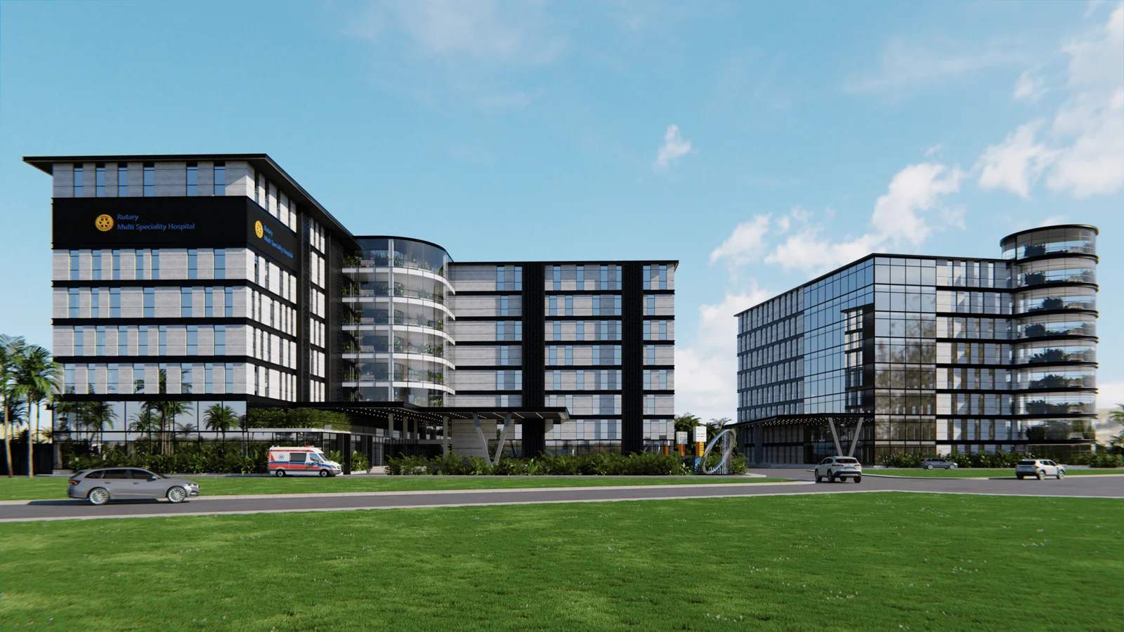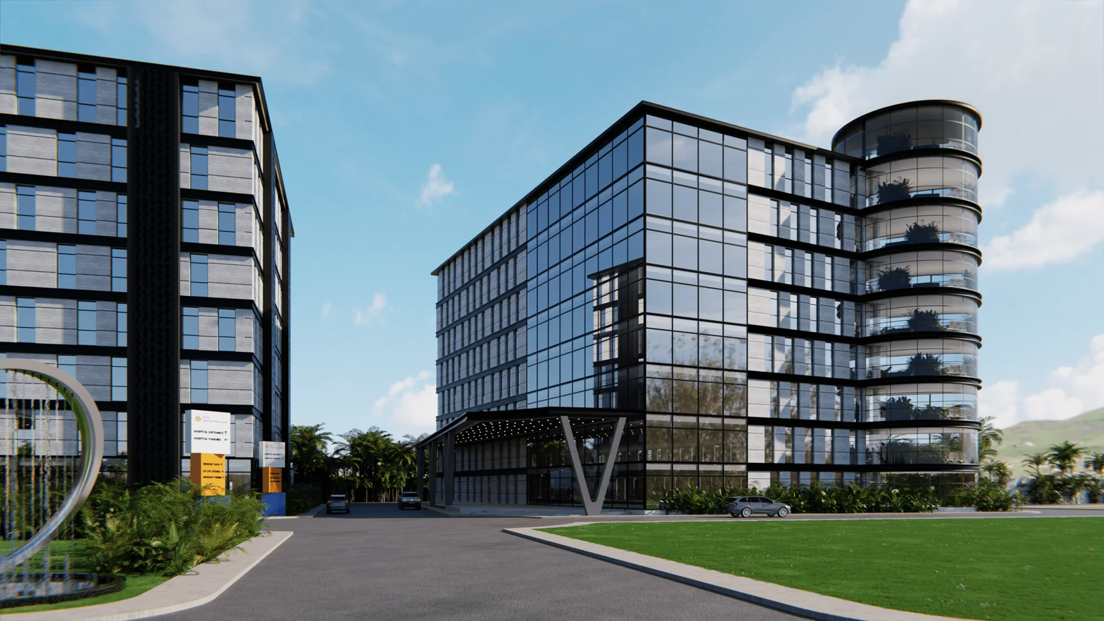 The exterior of the Medical Hospital and College campus is a striking example of modern institutional architecture, spanning approximately 8,00,000 sq ft with a 450-bed capacity. The design is characterized by a bold, multi-story structure with a dynamic interplay of contrasting materials and forms. The facade features sleek black paneling and extensive glass curtain walls that create a sense of transparency and openness. A central, curved glass atrium with cascading greenery acts as a vibrant focal point, while the strategic use of balconies and setbacks adds visual interest and rhythm to the building’s massing. The design is both imposing and inviting, with a welcoming entrance canopy and well-planned landscaping that includes palm trees and green spaces, reflecting the institution’s commitment to nature and well-being.
