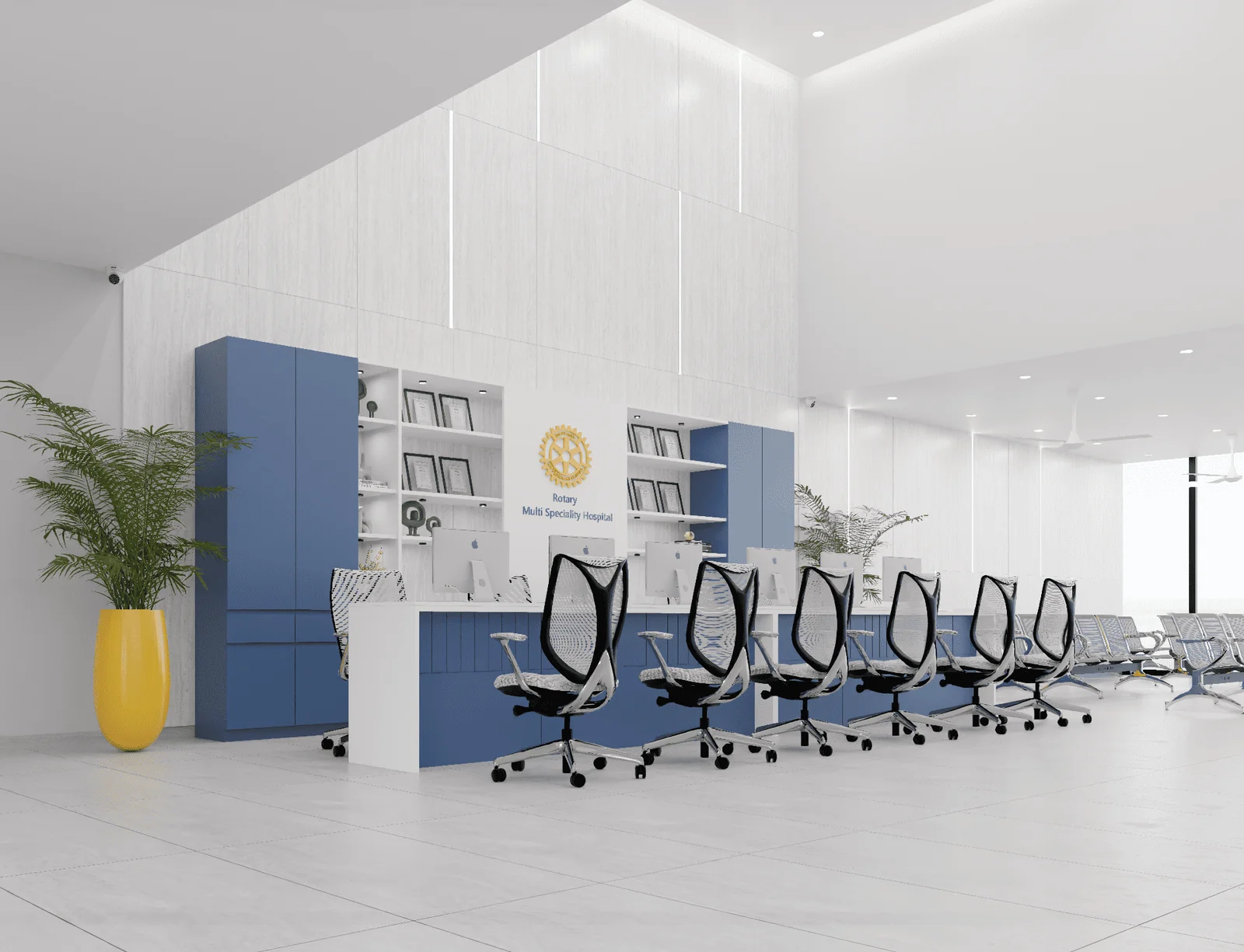 The Main Reception area is a masterclass in functional and aesthetic design. The space is dominated by a long, clean-lined reception counter with a bold blue and white color scheme that feels both professional and calming. The backdrop is a clean, white wall with subtle vertical grooves and integrated lighting that highlights the “Rotary Multi-Speciality Hospital” logo. The space is open and airy, with a high ceiling that features subtle lighting details, creating a feeling of spaciousness. The seating is arranged in a linear fashion, with rows of ergonomic chairs that ensure a smooth flow of traffic and efficient queue management. This design prioritizes clarity and efficiency, ensuring a stress-free experience for patients and visitors.