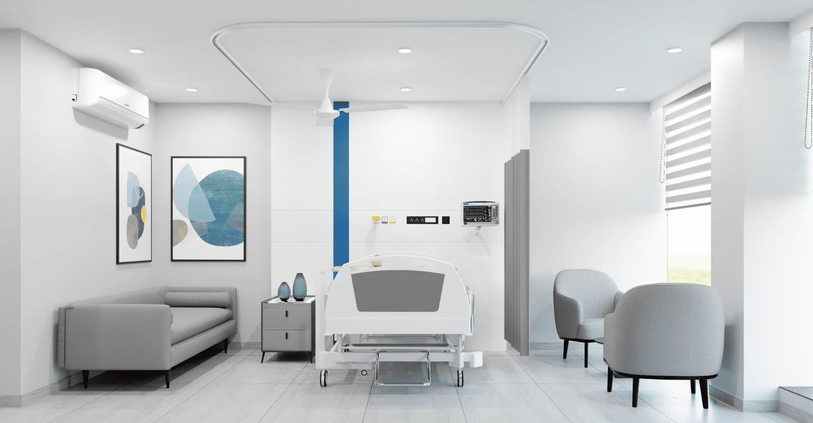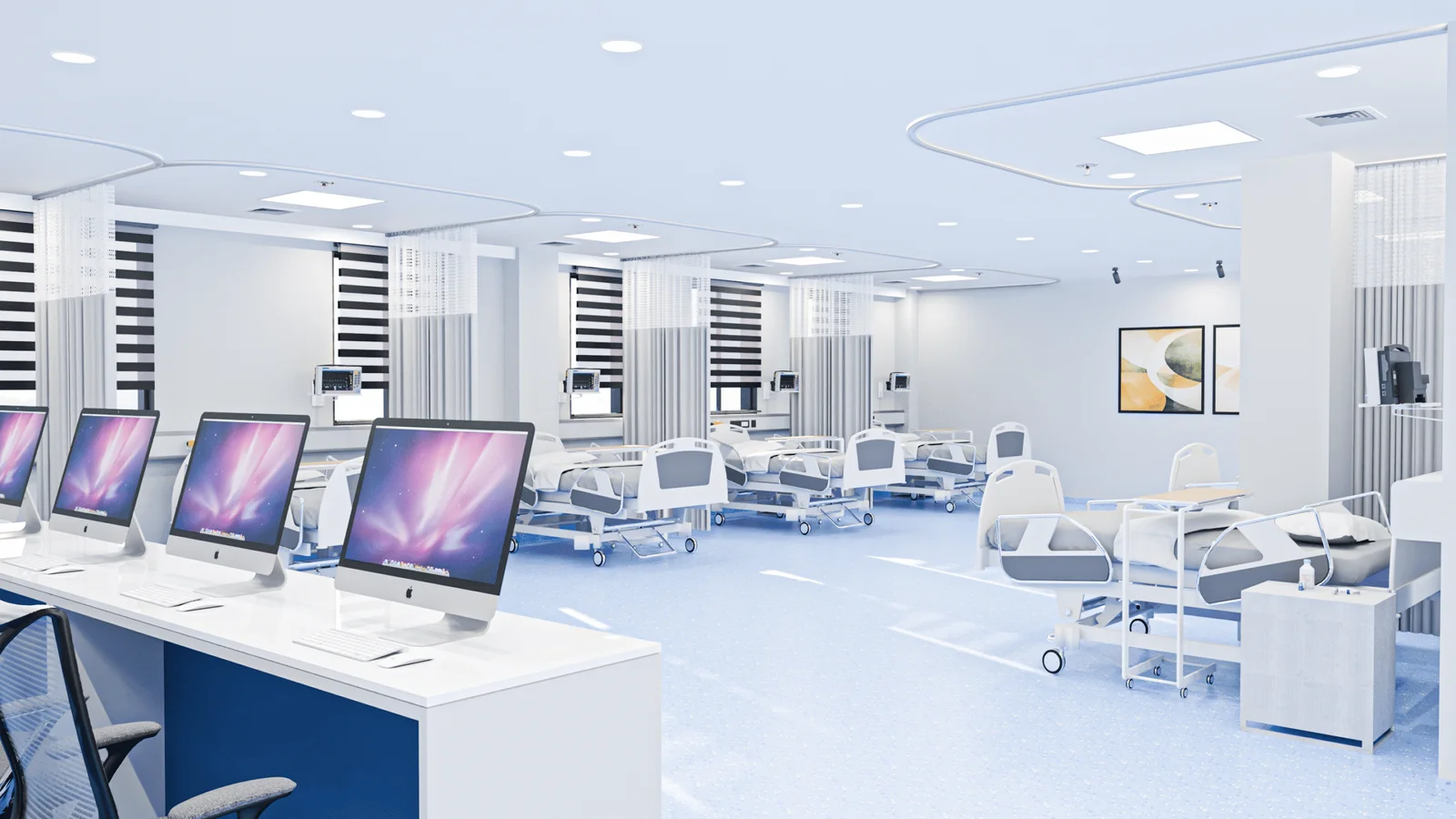 The general ward is designed to be a comfortable and functional space for multiple patients. The layout is optimized for efficiency, with beds arranged in a neat, symmetrical pattern, each with its own privacy curtain. The design utilizes a bright white base with vibrant blue cabinetry and accent panels, creating a clean and professional aesthetic that feels more inviting than traditional hospital wards. The lighting is bright and even, with a combination of recessed ceiling lights and individual reading lights. The space also features a dedicated counter area with a sink and storage, providing staff with a functional and organized workspace.