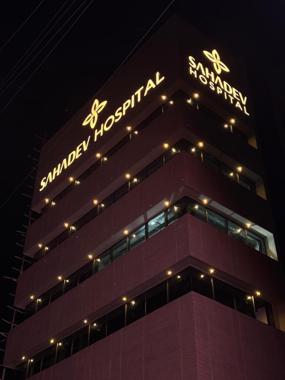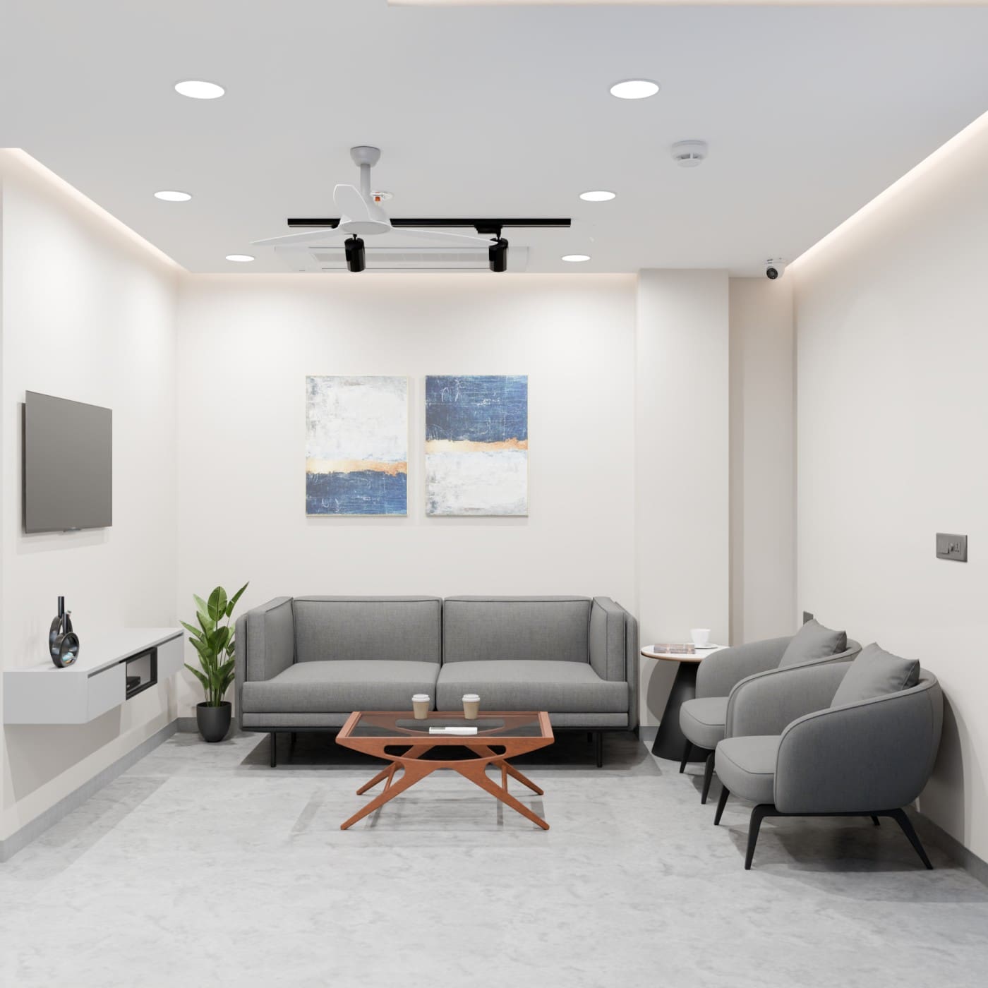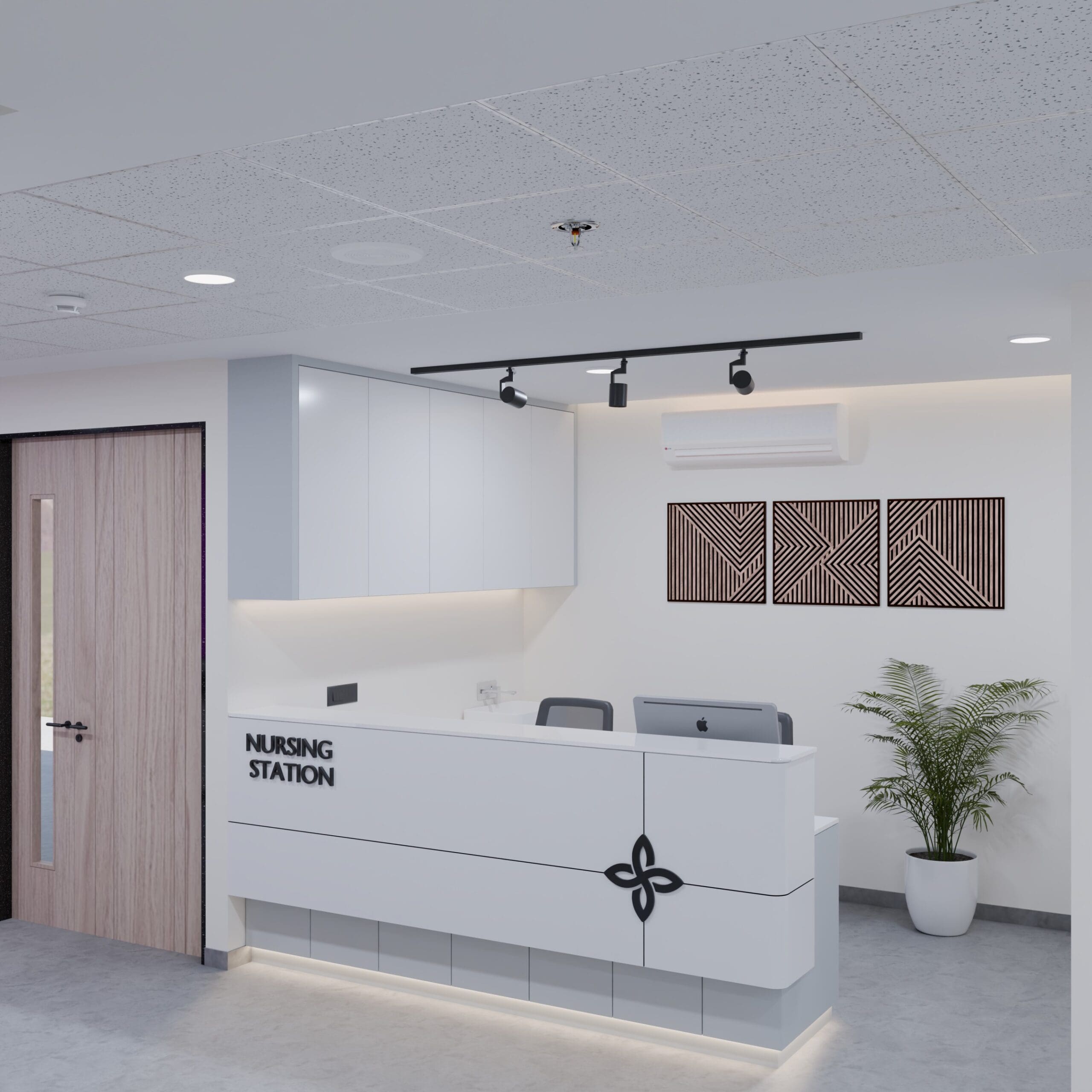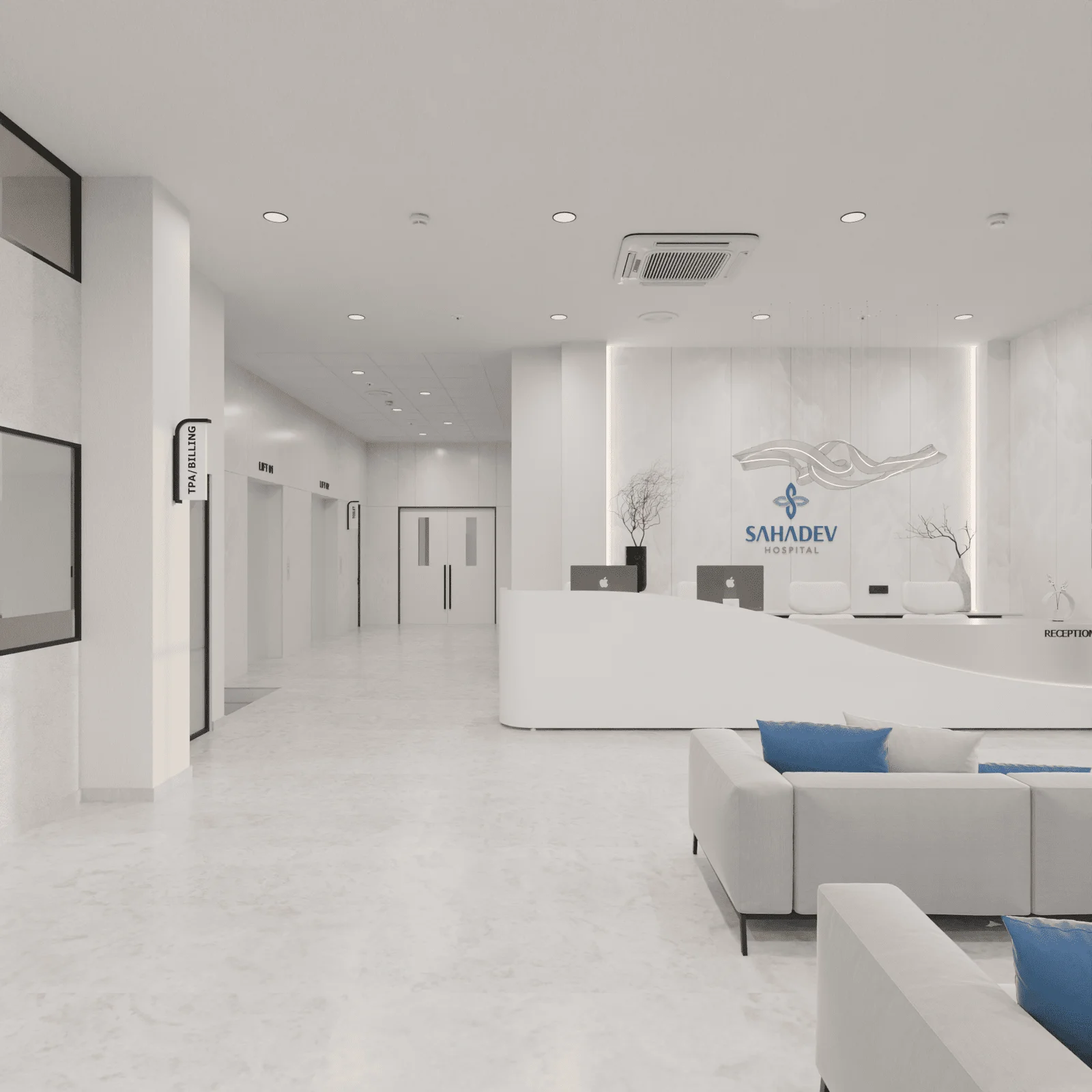 Sahdev Hospital’s reception area is a masterclass in minimalist design aimed at reducing patient anxiety. The space is dominated by a crisp, white palette, accented by subtle touches of blue in the cushions. The reception desk is a sculptural, curved form that breaks the rigidity of a typical counter, creating a softer, more inviting point of contact. The hospital’s logo is beautifully integrated into a backlit wall feature, acting as a serene focal point that reinforces branding without visual clutter. The polished, seamless flooring and clean lines throughout the space, including the concealed lighting and flush doors, speak of hygiene and precision, which are paramount in a healthcare setting.