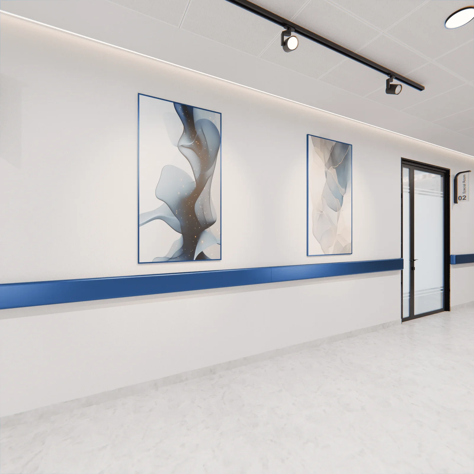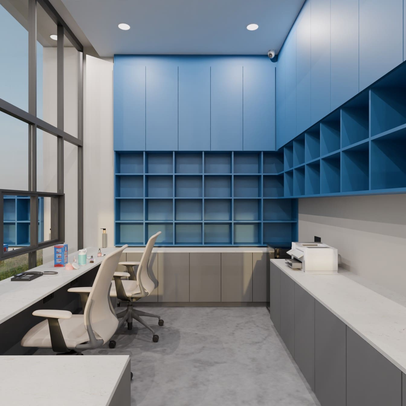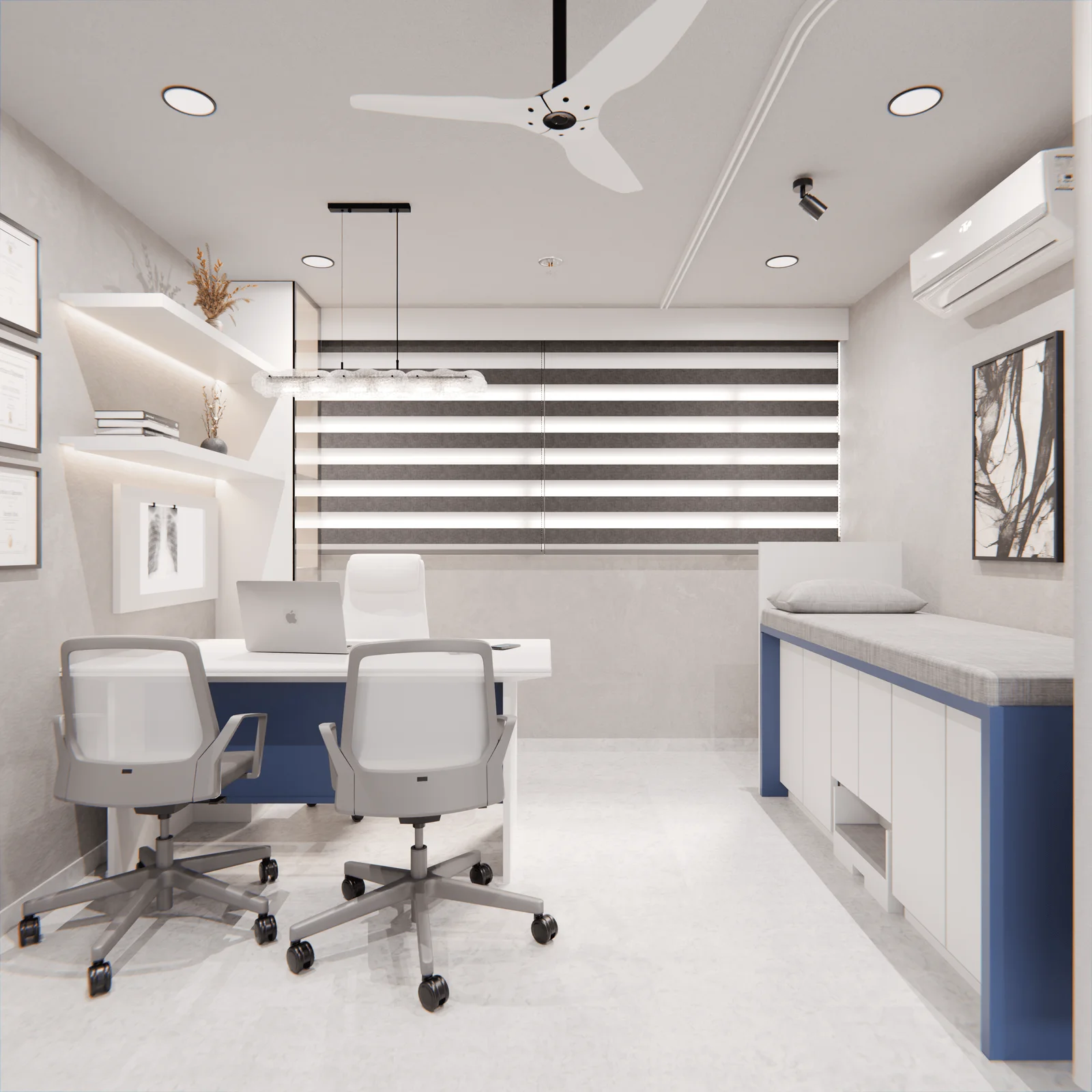 The Out-Patient Department (OPD) office is designed for both clinical efficiency and patient comfort. The space is bright and uncluttered, promoting a professional and calm atmosphere. The design employs a neutral palette with a pop of cobalt blue on the cabinetry, a strategic color choice that adds a touch of vibrancy without being distracting. Ergonomic seating for both the doctor and patient signals a commitment to comfort during consultations. Integrated lighting—from the minimalist pendant over the desk to the subtle shelf lighting—ensures the space is well-lit for both examination and conversation.
