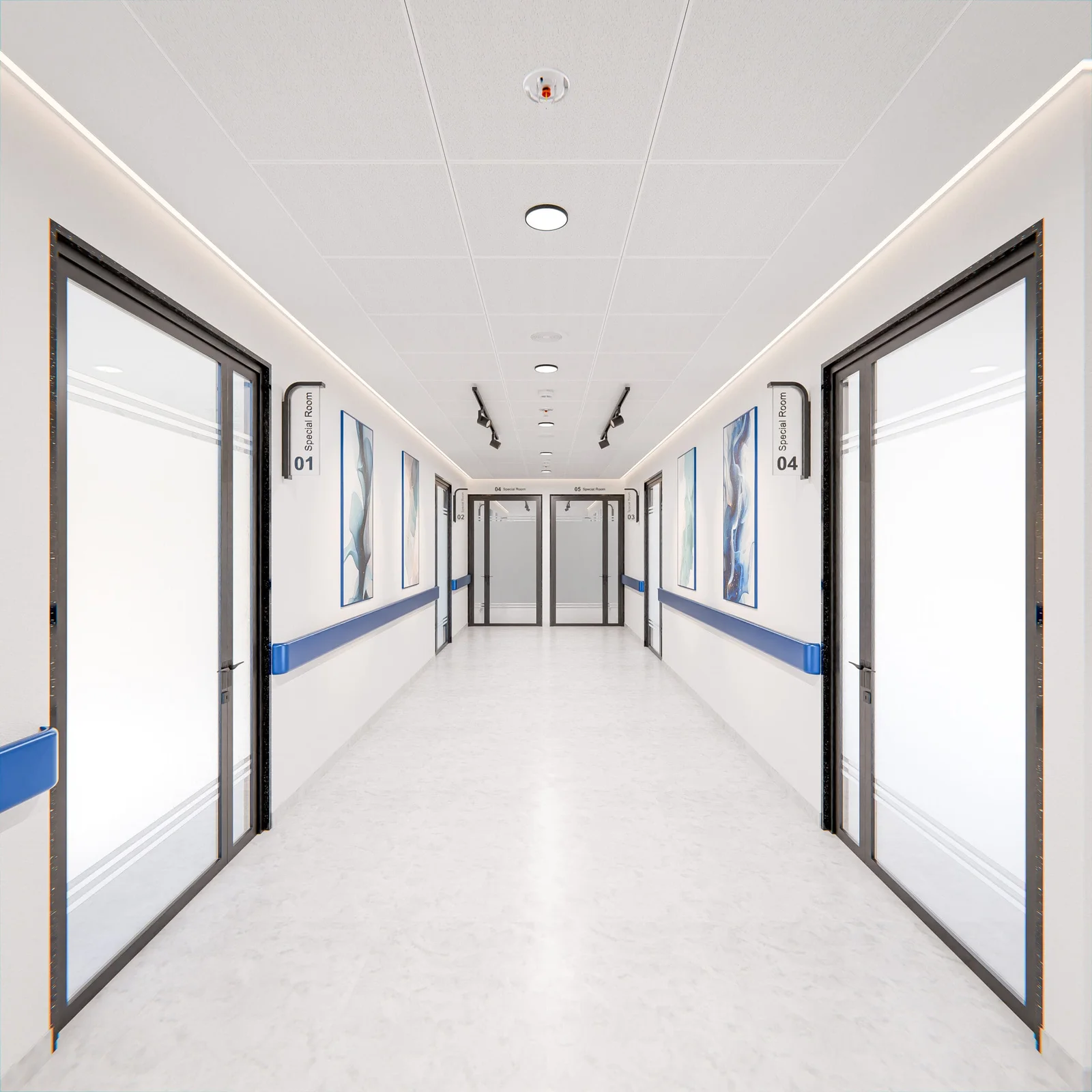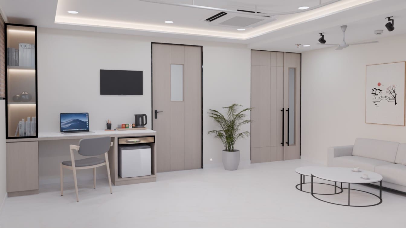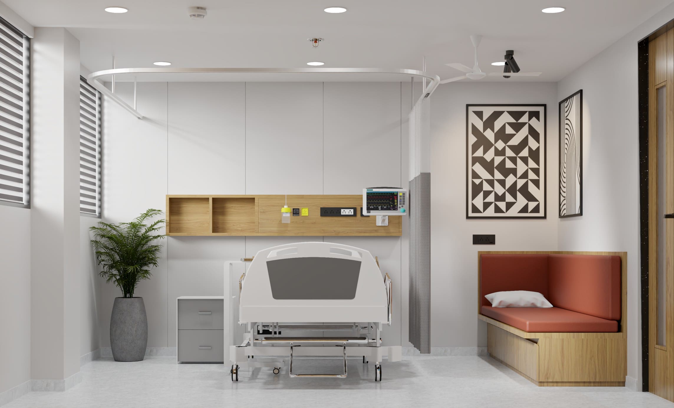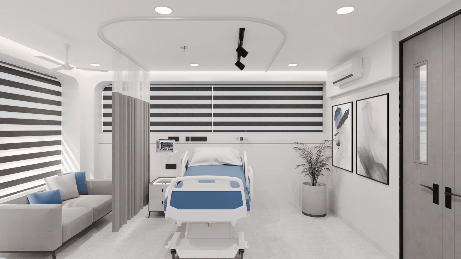 The patient suite is a sanctuary of comfort and care. This is not just a room, but a healing environment where every element supports patient well-being. The design is light and airy, with a neutral color scheme and large windows that allow for abundant natural light. The room is cleverly zoned, with a separate seating area for visitors, ensuring the patient’s immediate space remains a private zone for rest. The subtle use of art, a potted plant, and warm cove lighting adds a residential touch, reducing the institutional feel. The retractable curtain system offers flexibility for privacy, while the integrated medical equipment is discreetly placed to maintain a calming aesthetic.