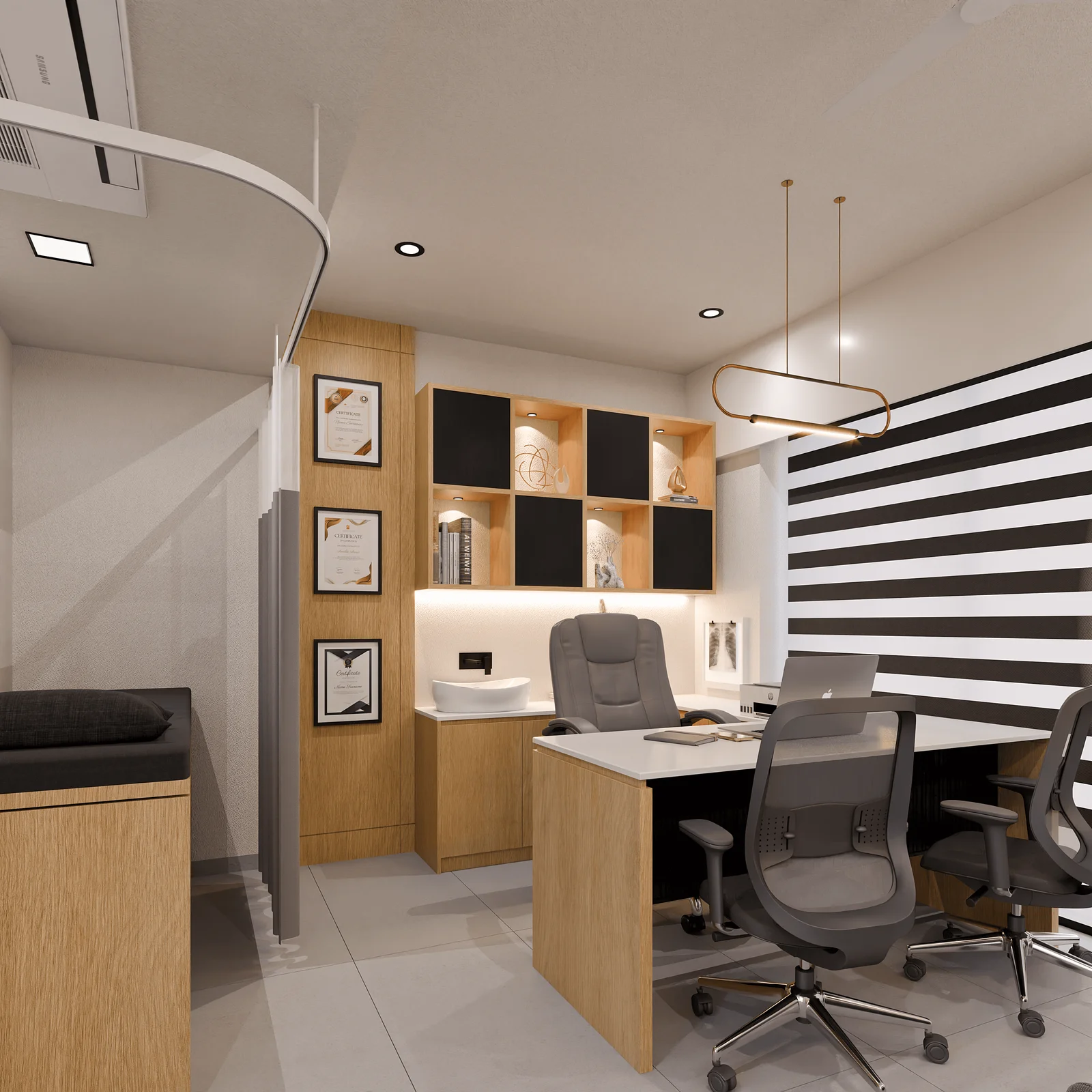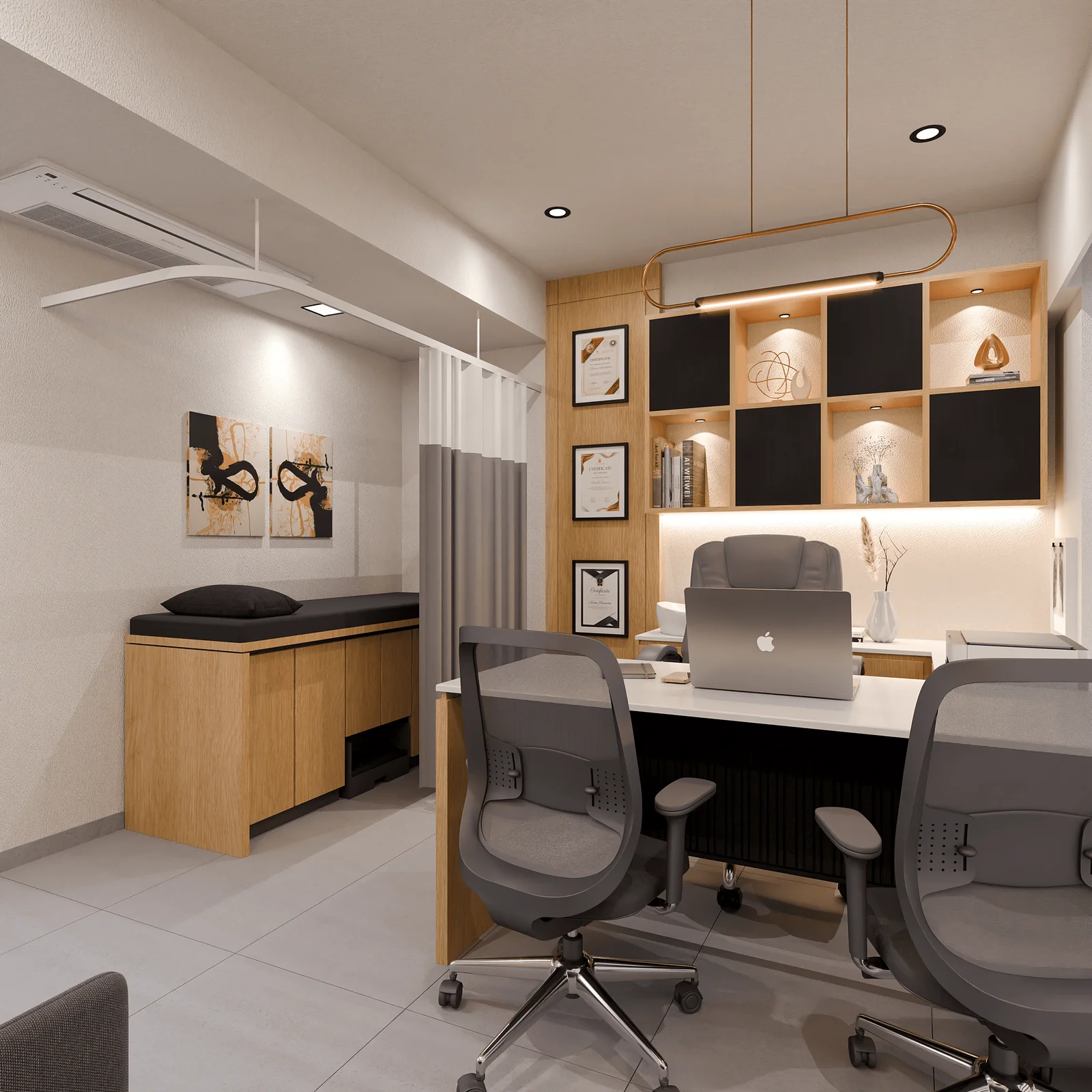 We adopted a modern-minimalist theme rooted in warmth and precision. Natural materials like wood veneers, soft textures, and matte finishes were harmonized with contemporary lighting elements to create an atmosphere that feels both professional and personal.