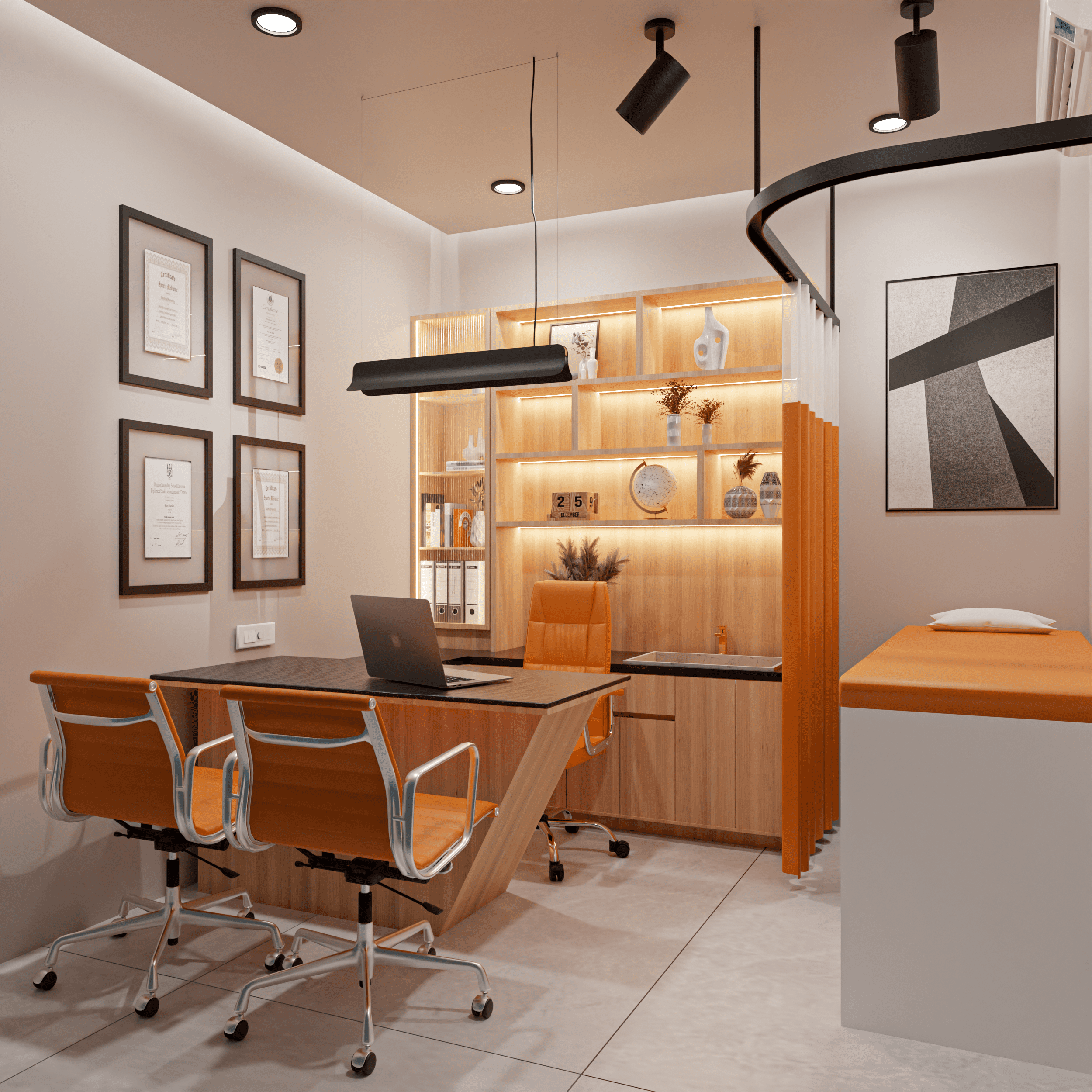 Each consultation space is designed for focus and flow. Warm wood tones meet contemporary lighting to create zones that feel personal, not procedural. A mix of display niches, soft textures, and custom-built millwork adds dimension to the compact footprint. Wall-mounted certifications and curated decor reinforce professionalism, while clean spatial divisions prioritize both patient privacy and functional storage.