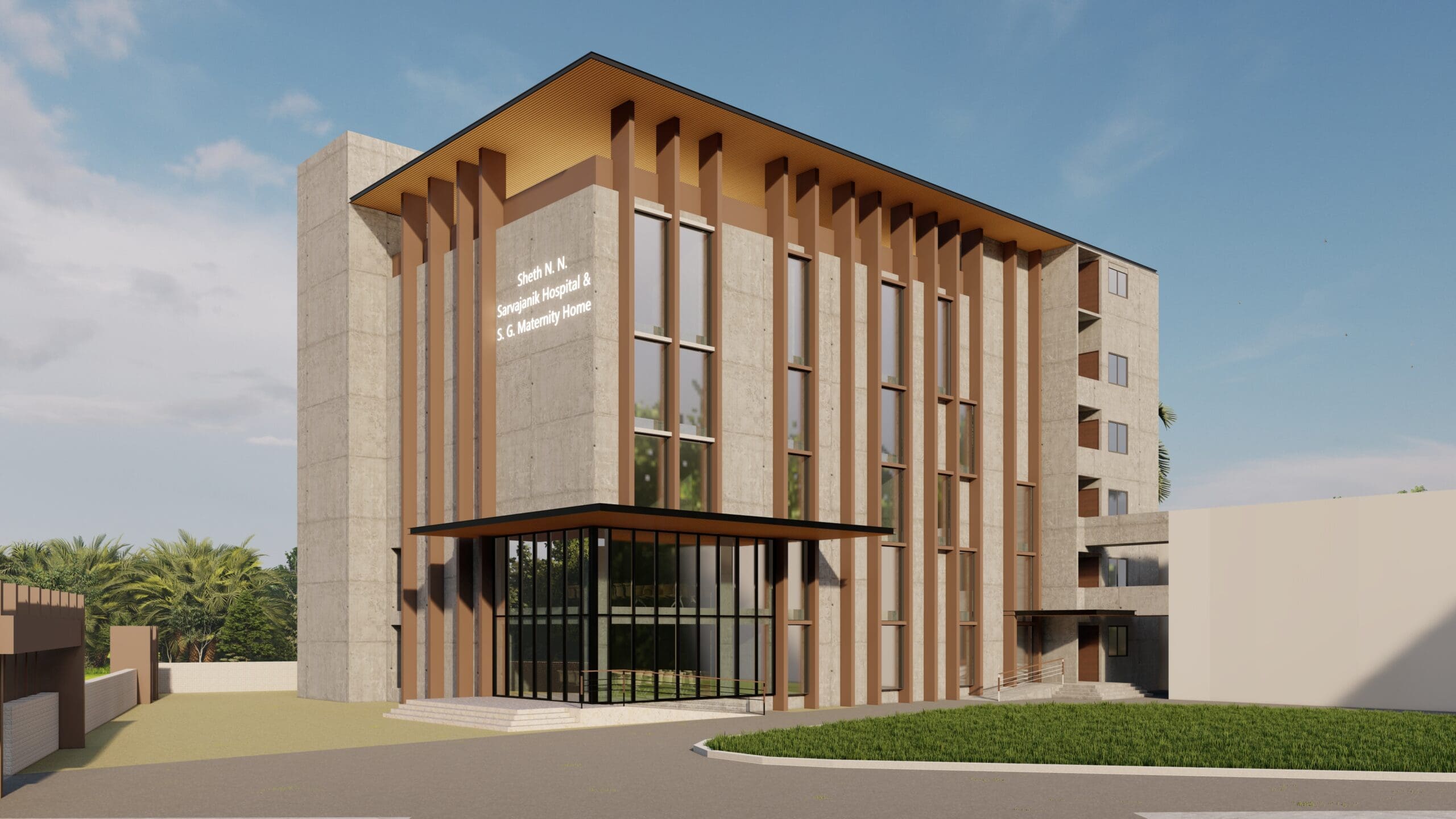 The floating canopy entry is a gesture of welcome — designed with linear rhythm and clean structure to guide visitors intuitively into the facility. Vertical piers reinforce a sense of stature, while the double-height glazed entrance infuses transparency and lightness into the otherwise solid mass.