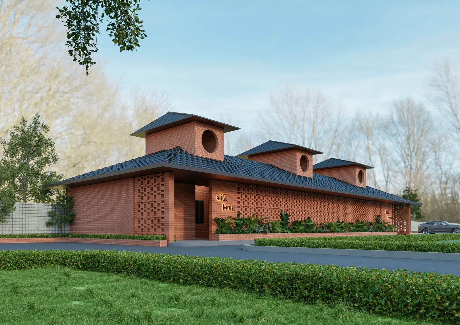 This staff housing block reimagines functionality with an architectural language rooted in simplicity and sustainability. The earthy red brick façade echoes vernacular sensibilities, while carefully patterned jali walls enhance natural ventilation and daylight penetration — creating passive comfort without mechanical dependence. The triplet roof lanterns act as both design identity and a climatic response — providing stack ventilation while accentuating vertical rhythm. Each element is calibrated for utility and low-maintenance durability, reflecting a timeless elegance suited to long-term institutional use. Landscape buffers and green hedging blend architecture with its context, offering privacy while enhancing the microclimate. The entrance signage, cast in warm brass typography, delivers a subtle sense of belonging and respect for the people who live and serve within