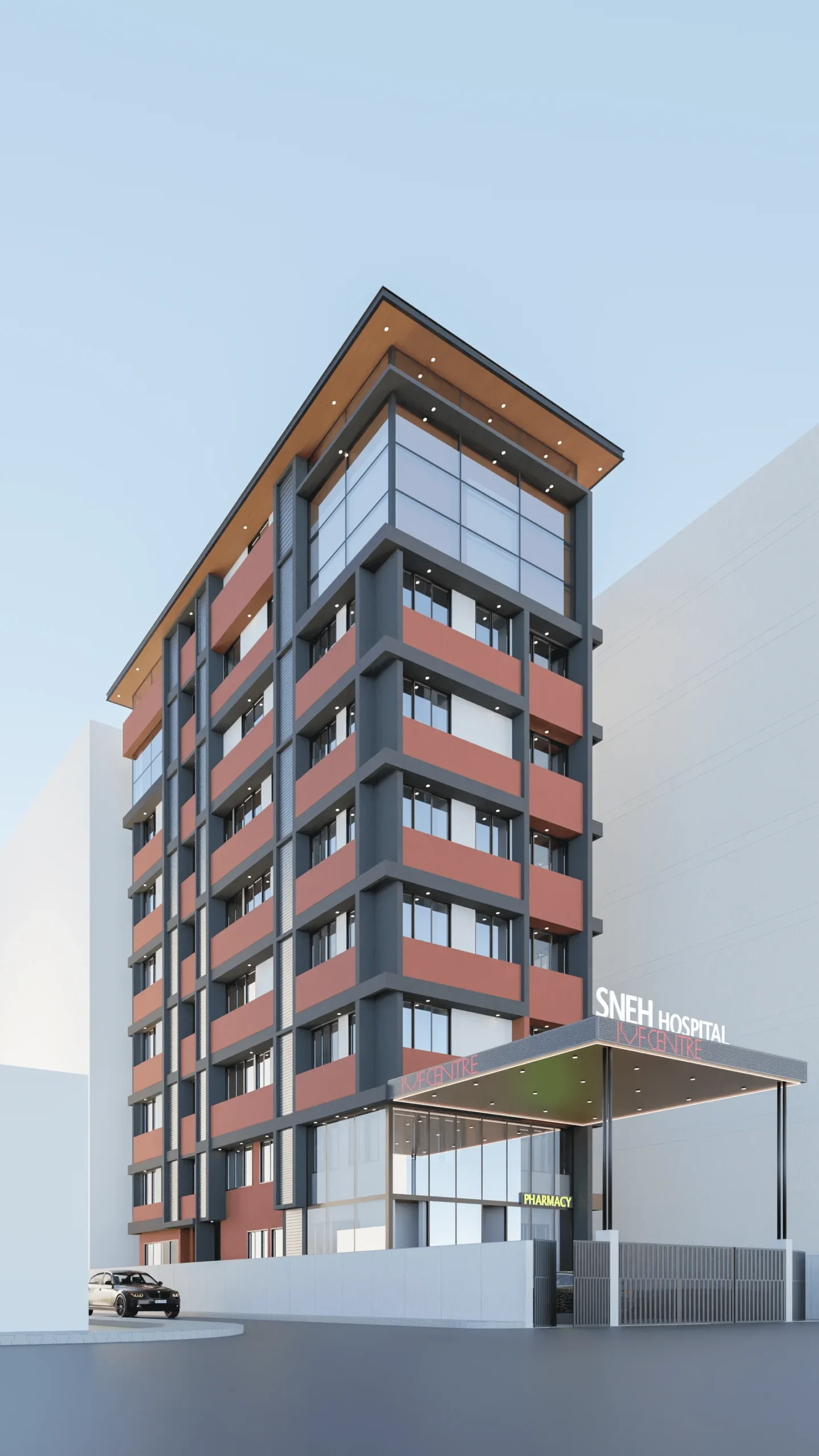 The exterior of Sneh Hospital is a bold statement of contemporary healthcare architecture. The building’s elevation is defined by a rhythmic pattern of solid and void, with a strong interplay between dark gray and warm, terracotta-colored panels. This combination creates a sophisticated and welcoming aesthetic. The use of a deep overhang and a covered entrance provides both functional shelter and a clear, defined entry point. Large, floor-to-ceiling windows on the upper floors bring in abundant natural light, a key element in patient recovery. Integrated signage is subtle yet clear, ensuring visitors can easily identify the hospital and key areas like the “PHARMACY,” making the building both beautiful and highly functional