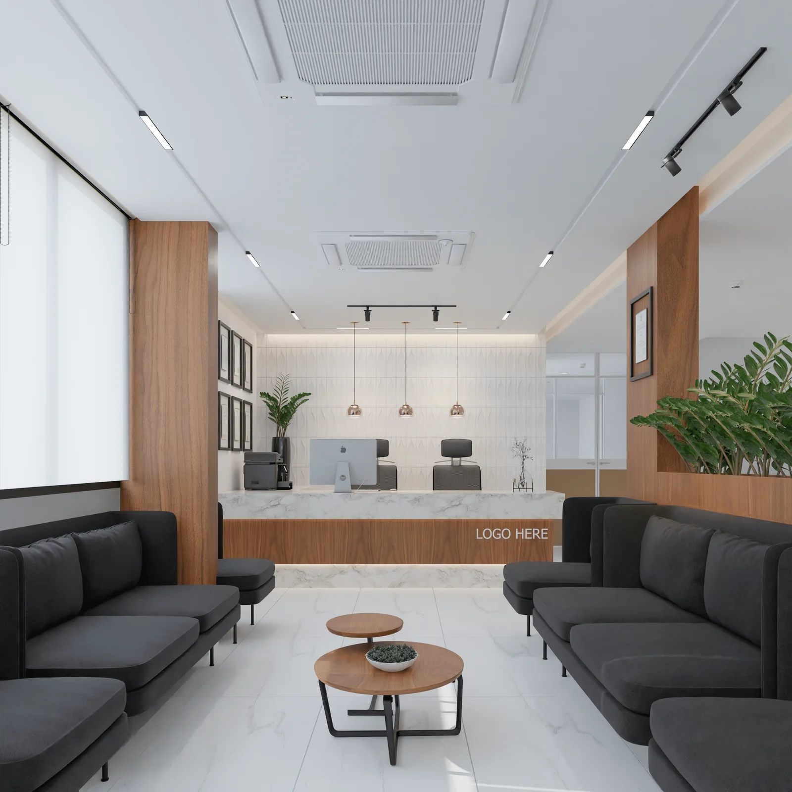 The design eschews a stark, clinical feel in favor of a natural, calming palette. The use of rich wood paneling on the walls and reception counter, combined with elegant marble-like finishes, creates a sense of sophistication and trust. The space is carefully zoned, with comfortable, dark gray seating areas offering a sense of privacy while maintaining an open feel. Layered lighting—from recessed ceiling lights to modern pendant fixtures—is used to create a soothing ambiance. Integrated planters introduce a biophilic element, adding life and a touch of nature that is proven to reduce stress and anxiety in a waiting environment.