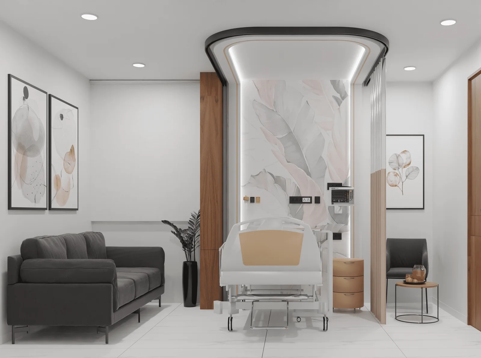 This patient room is designed as a sanctuary for recovery, meticulously crafted to feel more like a hotel suite than a hospital room. The design moves away from the institutional aesthetic with a feature wall behind the bed adorned with a soft, abstract mural of foliage in muted tones. This artistic touch introduces a biophilic element that promotes a sense of peace and connection to nature. The space is thoughtfully organized, with a dedicated area for a sofa, allowing family members to stay comfortably. The lighting is soft and ambient, with an illuminated ceiling detail over the bed that highlights the patient’s space while providing gentle light. The color palette is calming and refined, with touches of modern art and a simple plant, all contributing to an environment that supports emotional well-being and faster healing.
